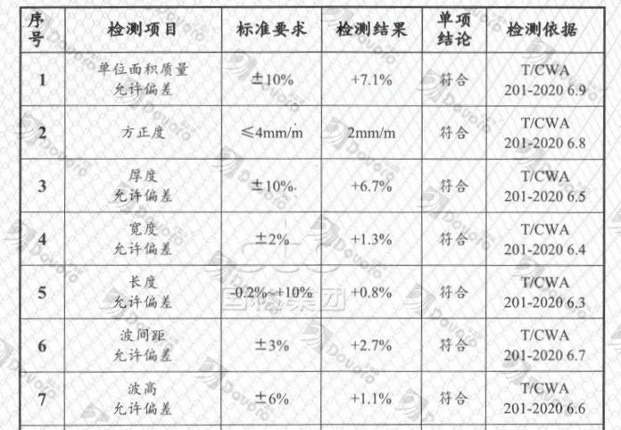 基础尺寸检测数值均在标准范围内。基础尺寸的稳定可以保障施工的精度,瓦材在屋面上可以严丝合缝。得益于多富瑞对生产设备的不断改进,自检制度的优化,多富瑞可以提供质量更加稳定的产品。