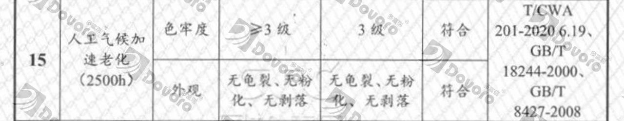 最后一项检测是人工气候加速老化测试,模拟不同的气候条件,测试瓦材的外观是否会有变化。经过测试后色牢度为三级,外观没有发生油漆龟裂、粉化、剥落的情况。